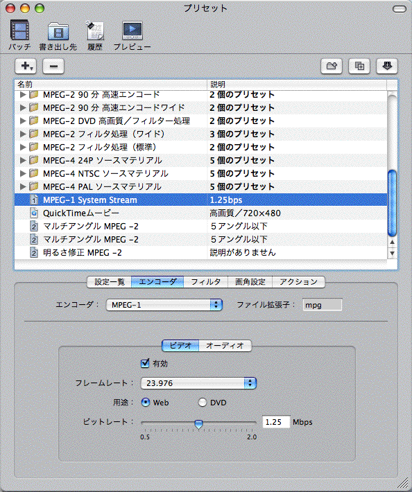 ※Compressor1.2は既にダウンロード可能になっていますが、MPEG-1のプリセットは用意されていません。ここでご紹介した画面では、新たにプリセットを作成してみました。