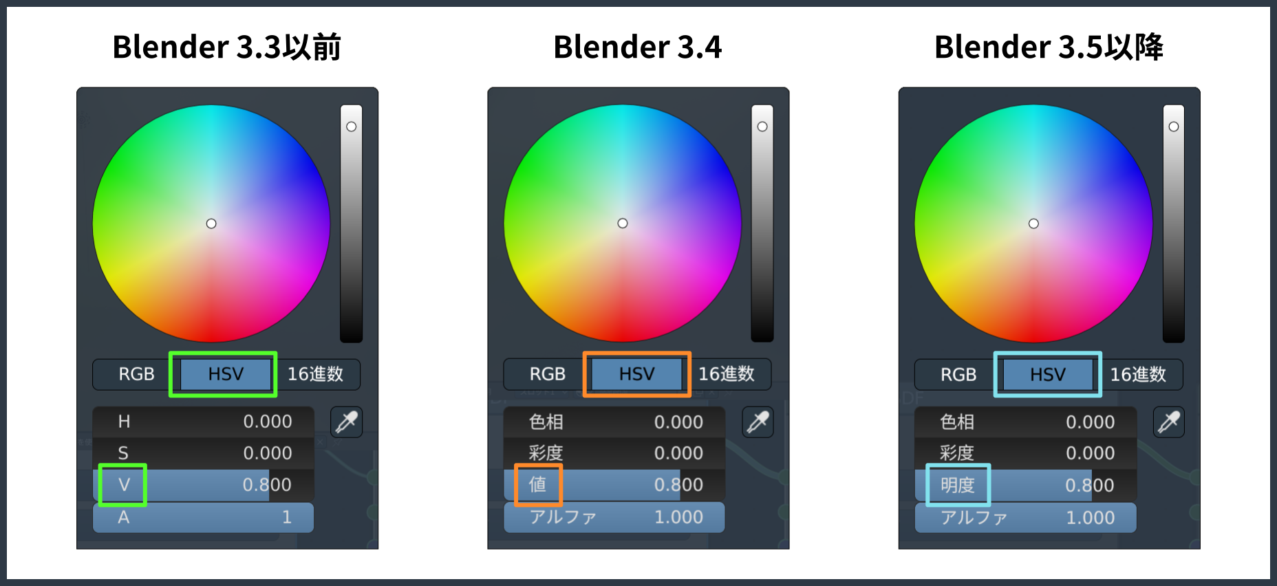 書籍の中で「V」または「V(明度)」と示してあるのは、カラーピッカーをHSV表示した時の、上から3つめのパラメーターです。 このパラメーターは、Blenderのバージョンによって、UIの表記が次のように異なります。